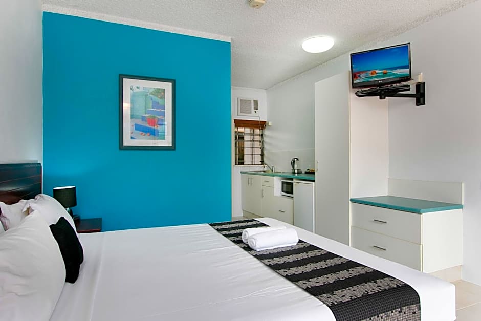This suite features a king size bed, a private bathroom and kitchen with an oven, hotplates, fridge, microwave, sink and large bench. There is also a sofa, TV with free in-house movies, iron, safe, hairdryer, tea/coffee and a balcony with a table and chairs. Free WiFi is included. The room is tiled and offers air-conditioning and a ceiling fan.